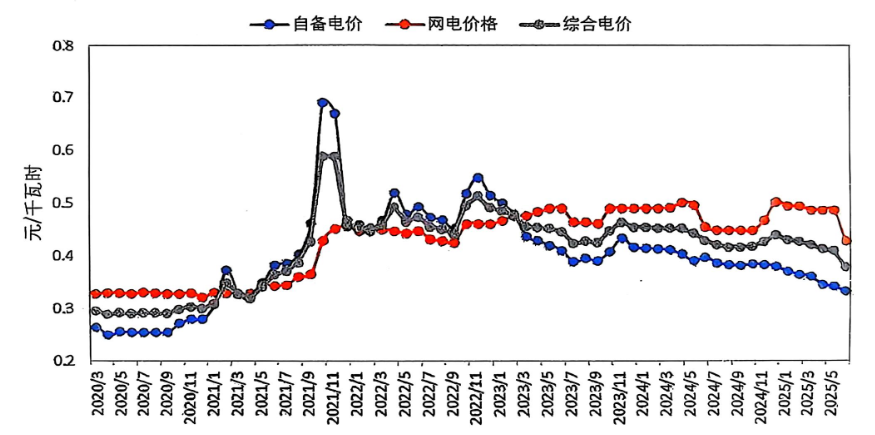 電力成本下降。截至6月底,中國電解鋁運(yùn)行產(chǎn)能中的自備電比例約55%;網(wǎng)電比例約45%。煤炭價格的持續(xù)下滑導(dǎo)致鋁企自備電價降低是2025年以來電解鋁行業(yè)電力成本下降的主要原因。2025年以來,煤炭主產(chǎn)區(qū)煤礦復(fù)產(chǎn)節(jié)奏加快,進(jìn)口煤到港量維持高位;而電煤因暖冬影響需求疲軟,非電行業(yè)又處于淡季,煤炭供應(yīng)寬松但需求疲軟,導(dǎo)致煤炭價格呈下行態(tài)勢,鋁廠自備電價逐步下跌。此外,廣西、云南、四川等地區(qū)網(wǎng)電價格均有不同程度的下調(diào),進(jìn)一步促進(jìn)了鋁企電力成本的下降。根據(jù)安泰科統(tǒng)計(jì),2025年6月份自備電加權(quán)平均價格為0.332元/千瓦時,較2024年末下降0.048元/千瓦時,較2024年同期下降0.065元/千瓦時;網(wǎng)電價格為0.428元/千瓦時,較2024年末下降0.074元/千瓦時,較2024年同期下降0.0276元/千瓦時;綜合加權(quán)平均電價為0.379元/千瓦時,較2024年末下降0.0507元/千瓦時。1-6月份綜合加權(quán)平均電價為0.414元/千瓦時,同比下降0.034元/千瓦時。